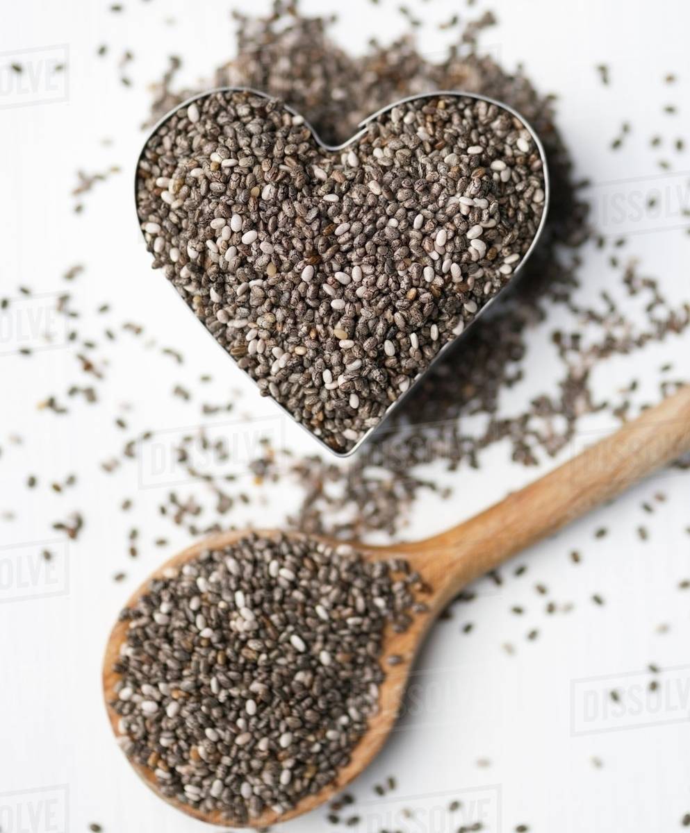 Chia Seeds In A Heart Shaped Mould And On A Wooden Spoon Stock