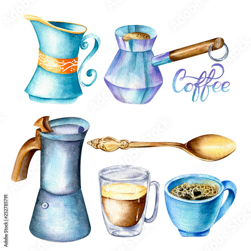 Watercolor Coffee Clipart Collection In Vintage Style Set Of Mugs Moka Pot Jezve Milk Holder And Spoon In Blue Gold And Violet Colors Buy This Stock Illustration And Explore Similar Illustrations