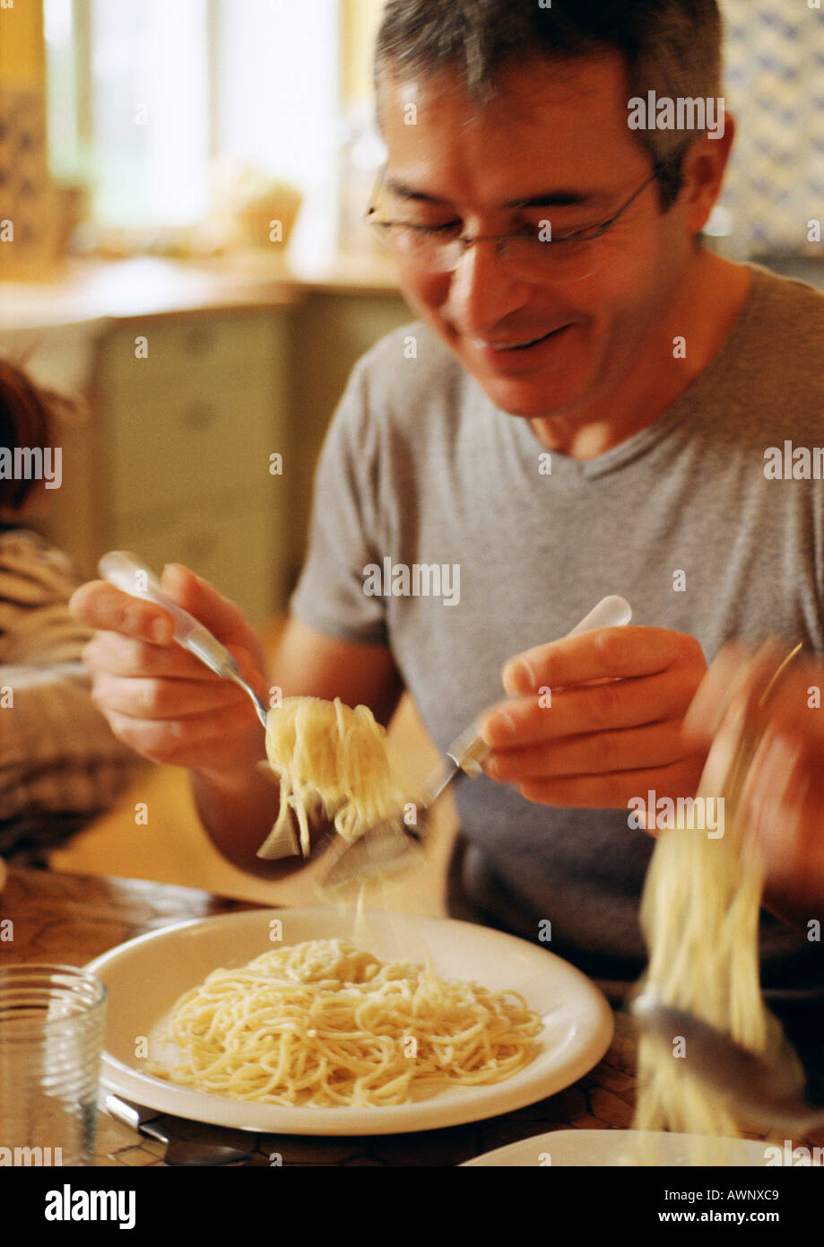 Man Eating Spaghetti With Fork And Spoon Blurred Motion Stock