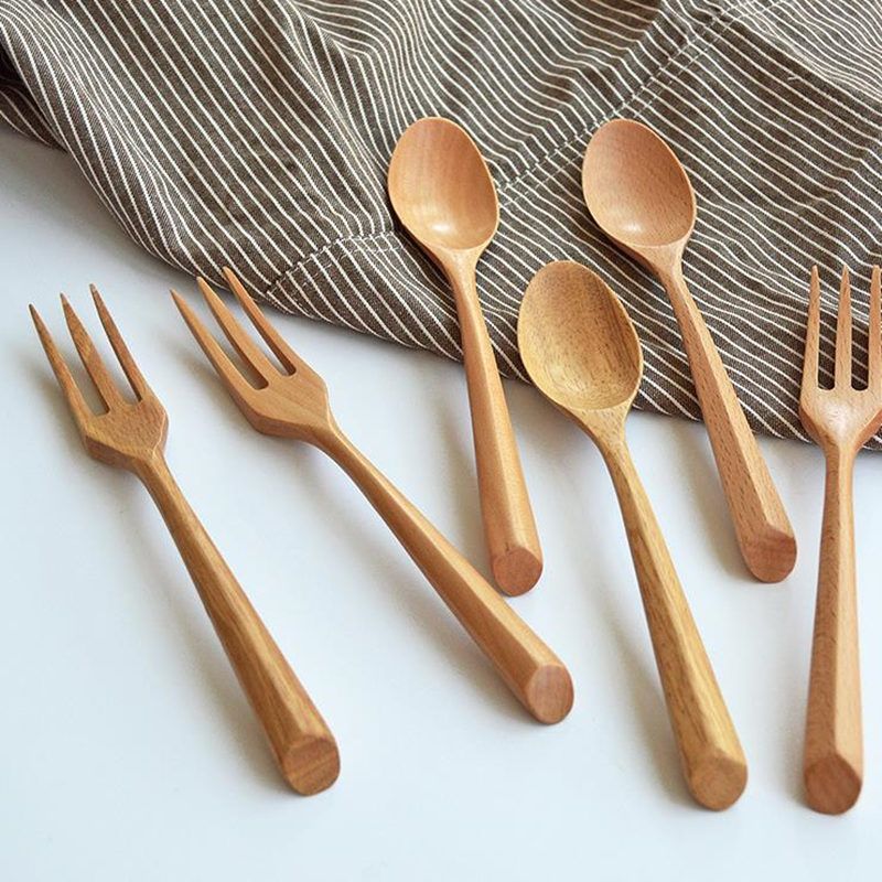 2020 Natural Wood Spoon Fork Set Japanese Style Dessert Fork