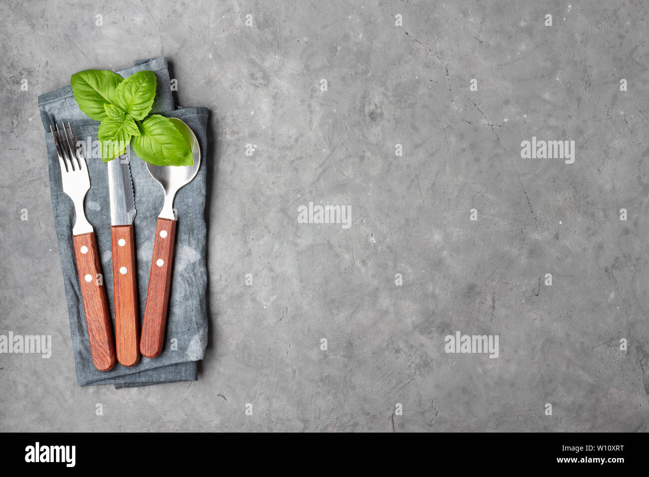 Set Of Cutlery Knife Spoon And Fork Over Gray Concrete Background