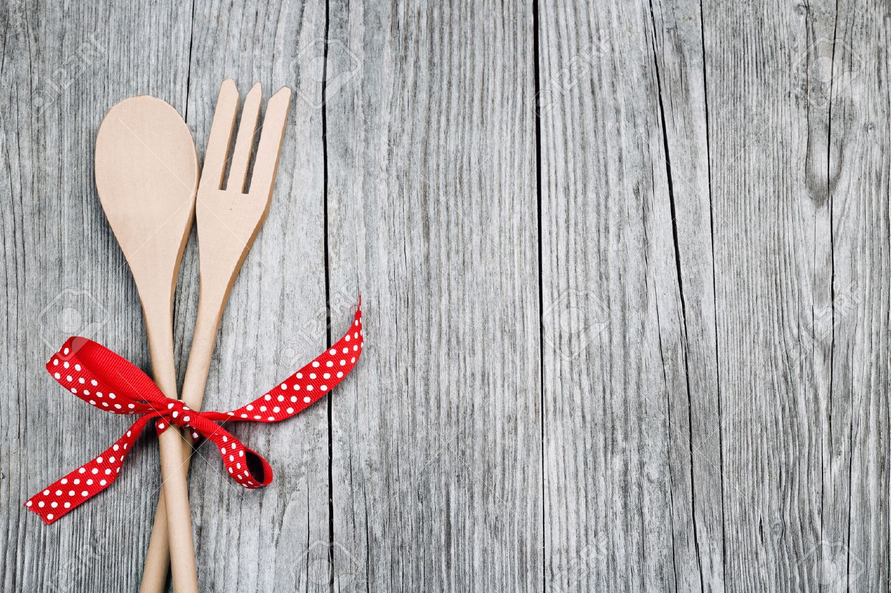 Wooden Spoon And Fork Tied Up With A Red Ribbon On Rustic