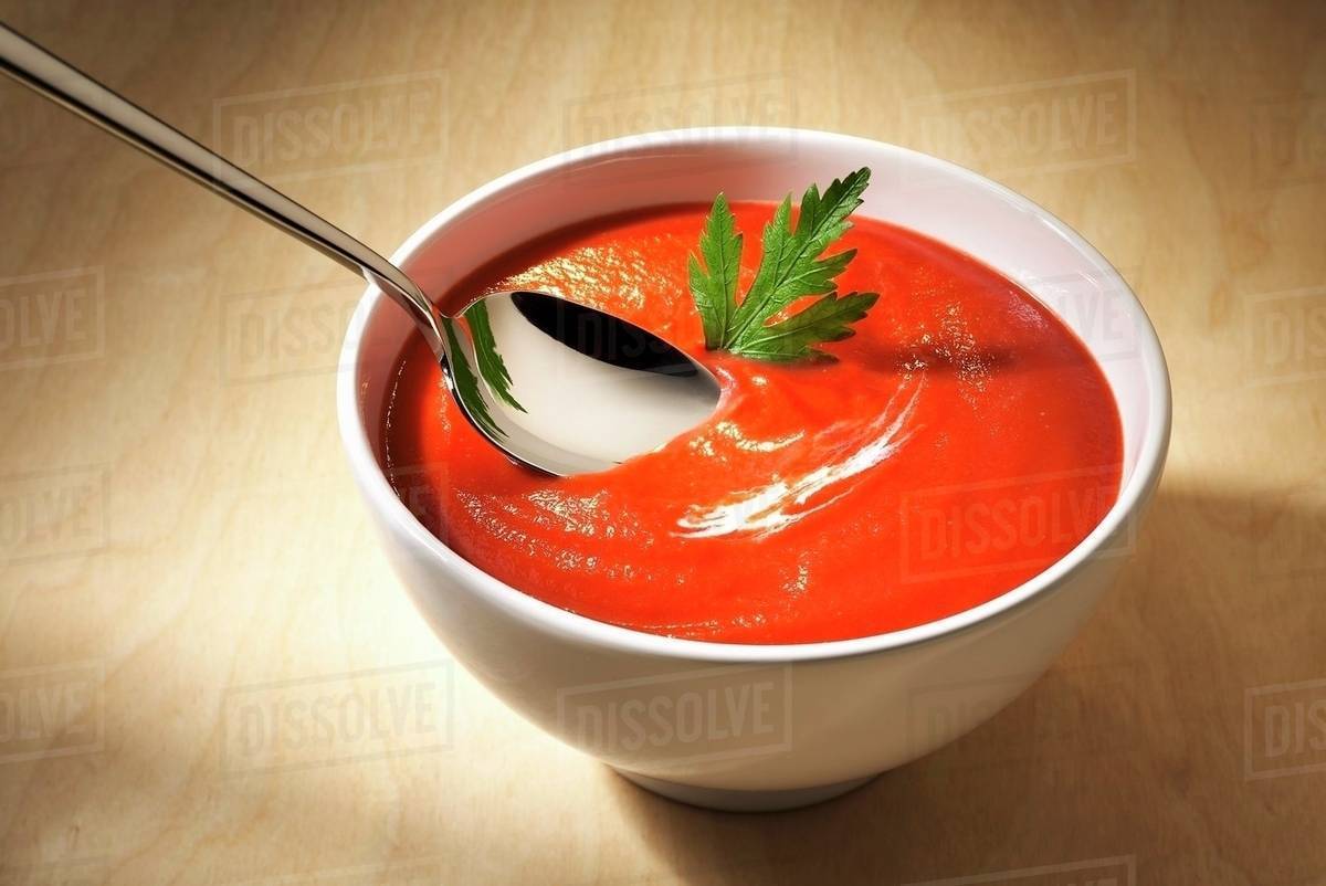 A Bowl Of Tomato Soup With A Spoon Stock Photo Dissolve