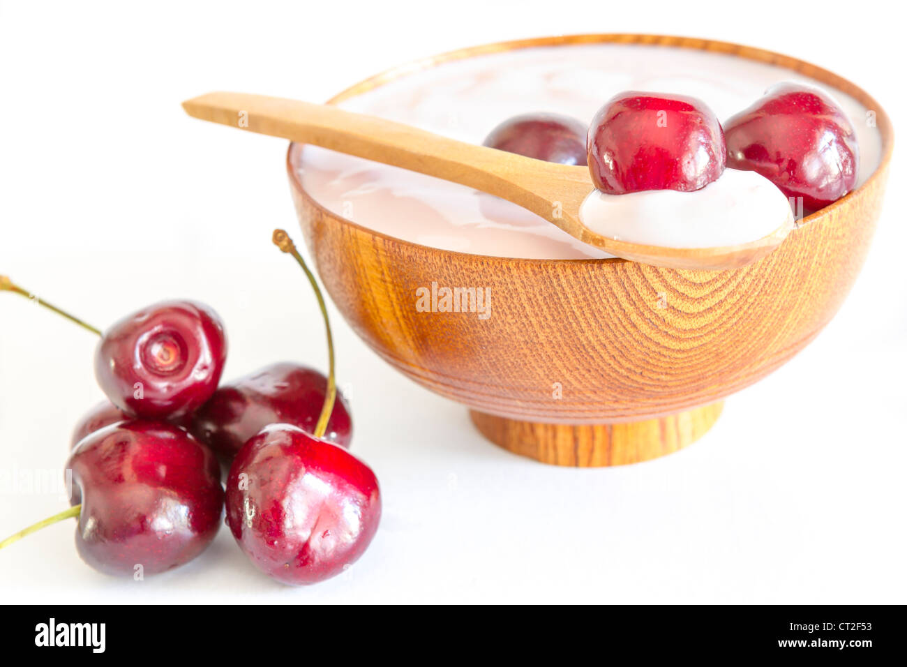 Fresh Cherries Fruits With Yogurt In A Wooden Bowl And Spoon Stock Photo 49228287 Alamy