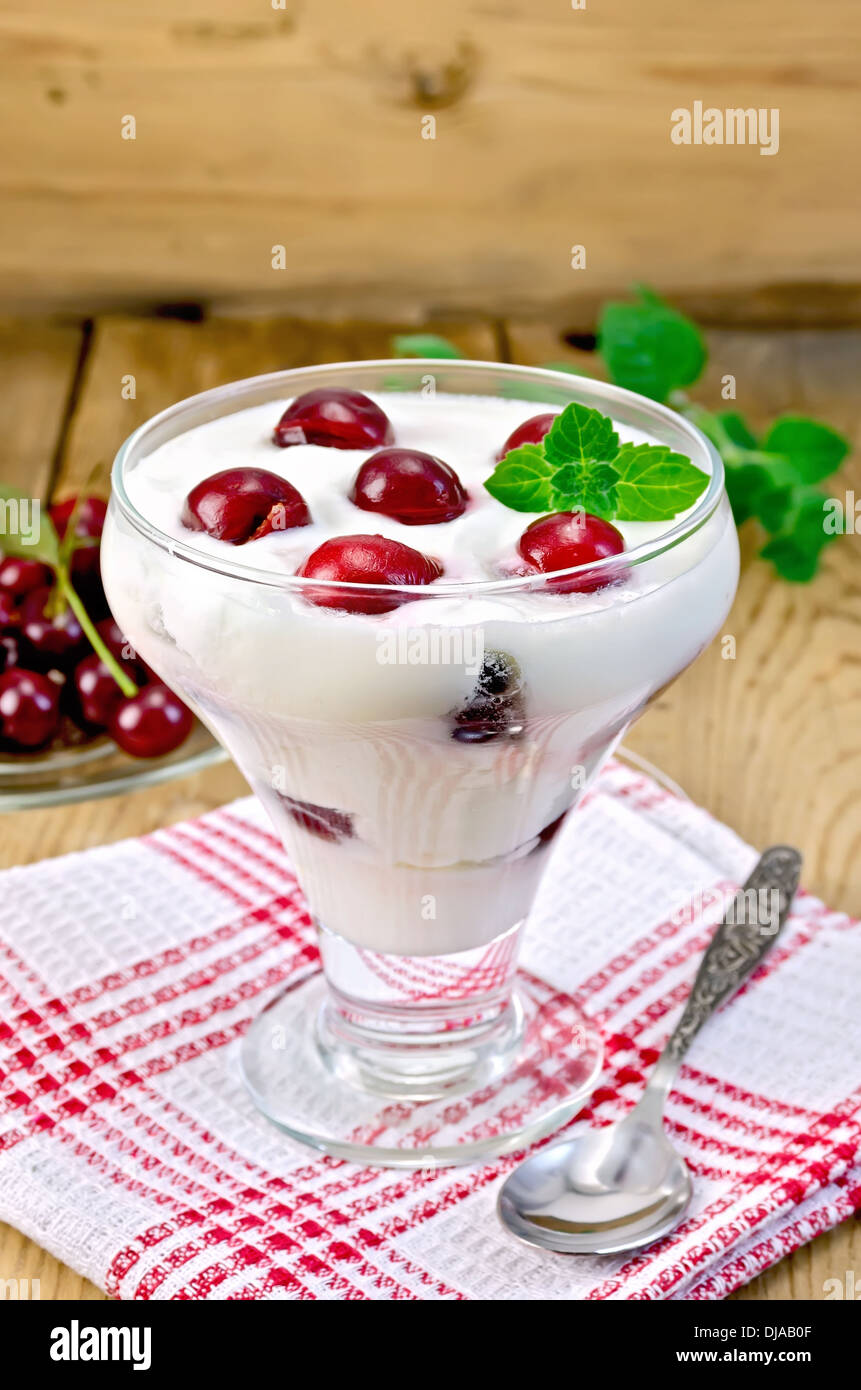 Thick Yogurt In Glass With Cherry And Spoon On A Napkin Cherries In Stock Photo 62923071 Alamy
