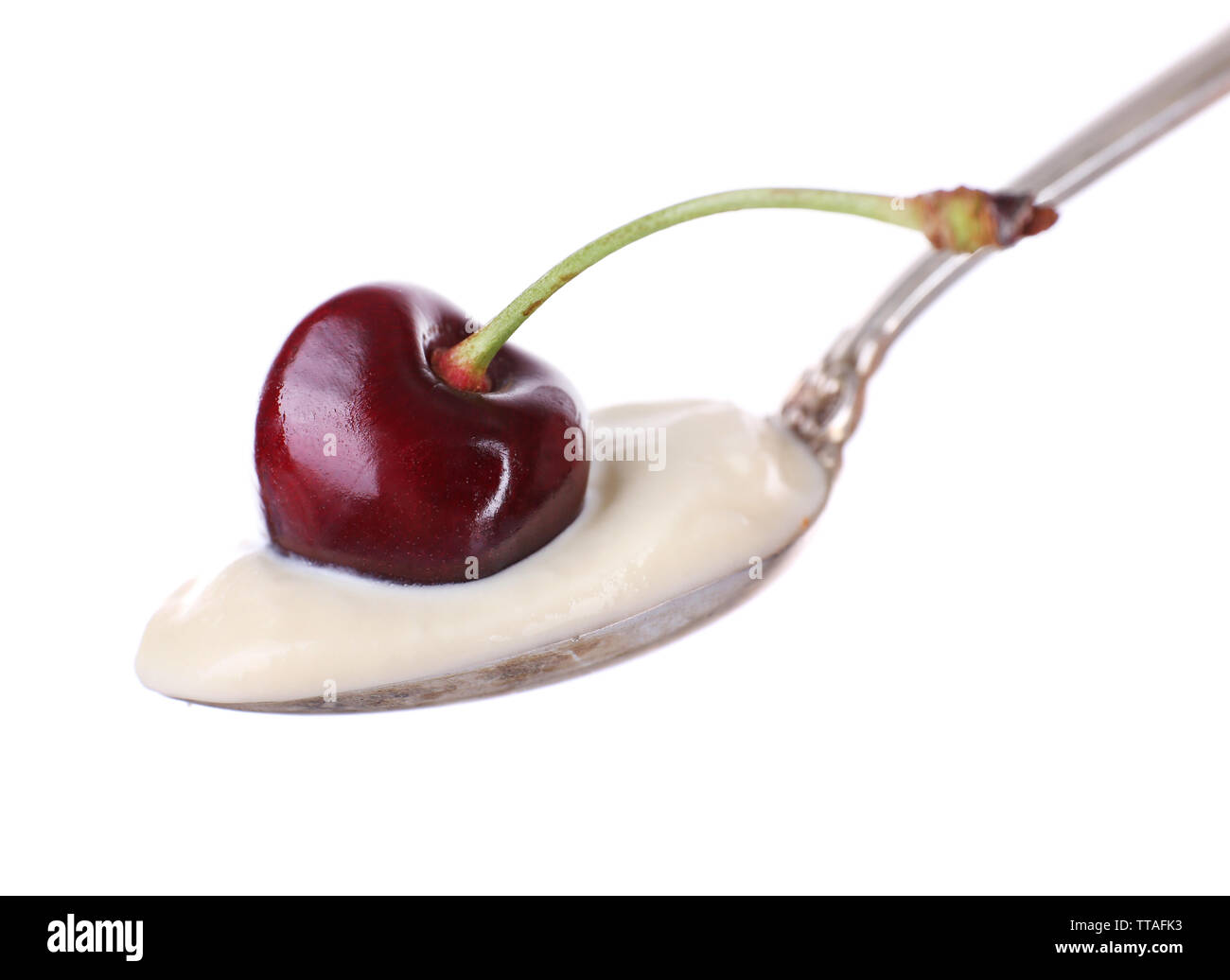 Delicious Yogurt In Spoon With Cherry Isolated On White Stock Photo 255928711 Alamy