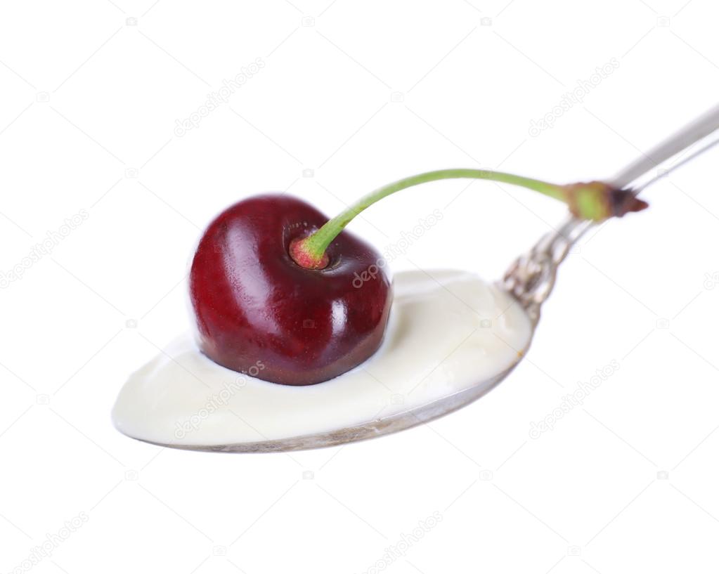 Plain Yogurt On A Spoon With Fresh Cherry On Top Isolated On White Background Stock Photo Image Of Food Dessert 137099346