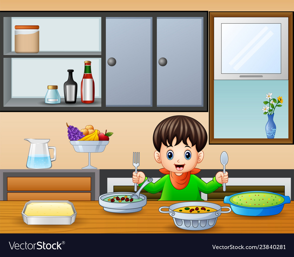 Happy Little Boy Holding Spoon And Fork Eating At Vector Image