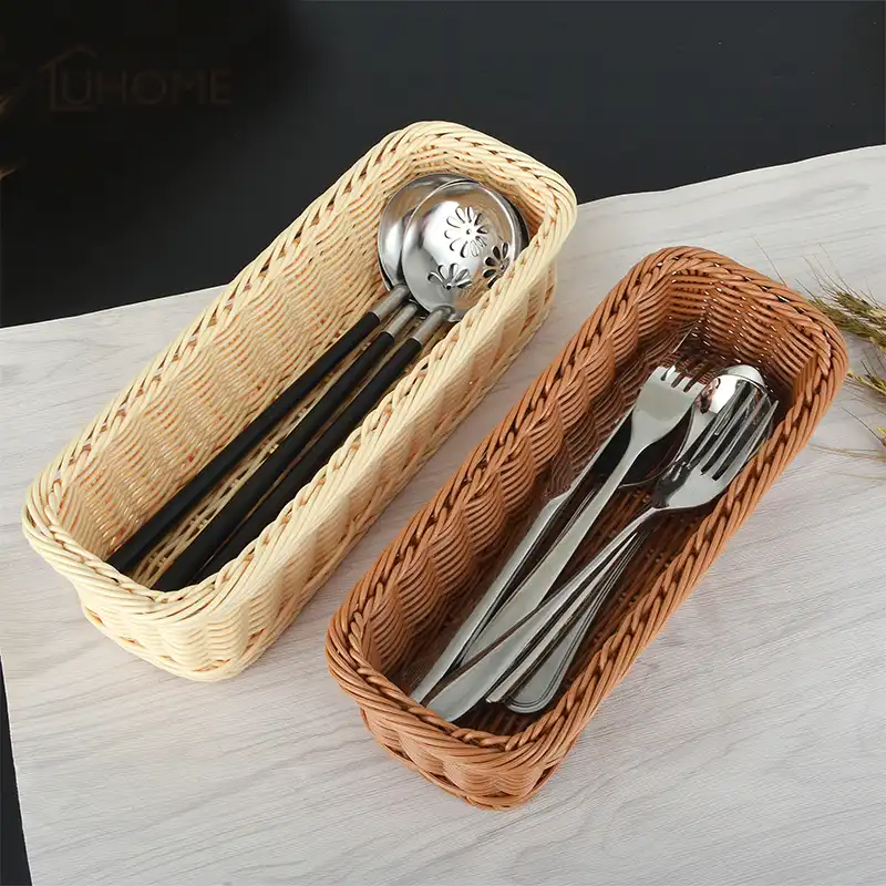 Square Rattan Bread Basket Fruit Food Fork Spoon Knife Storage