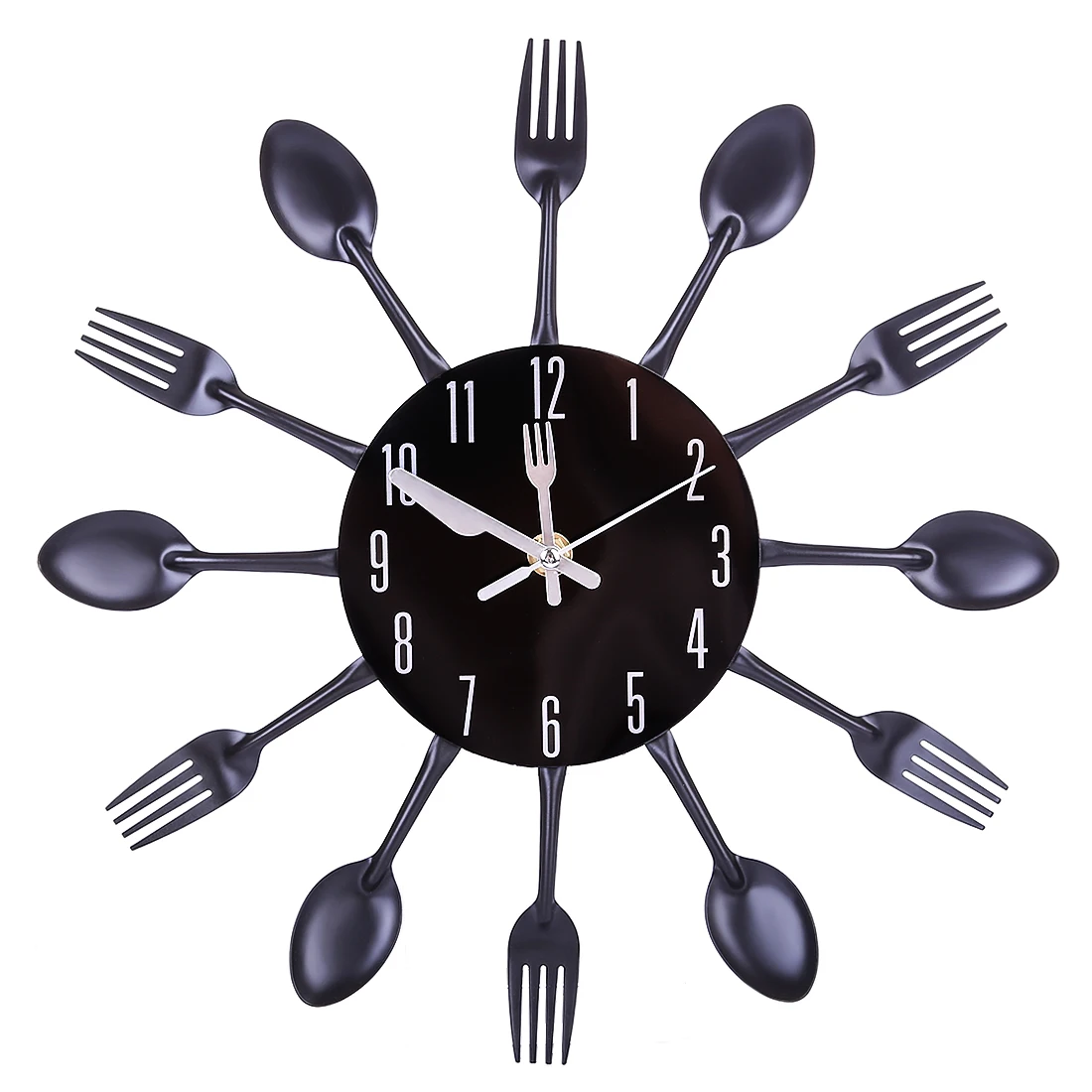Modern Design Silverblack Cutlery Kitchen Wall Clock Decor Spoon