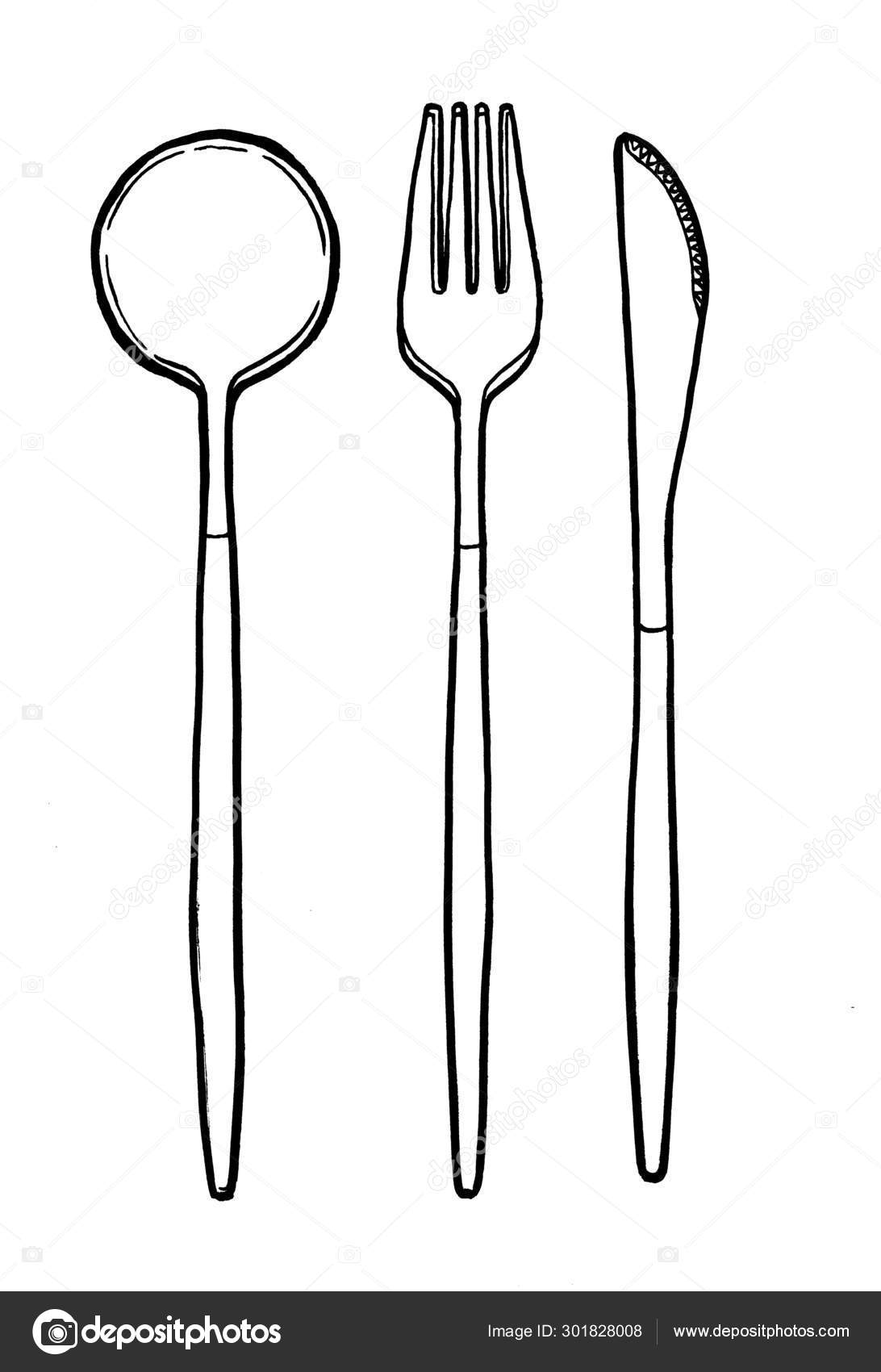 Cutlery Spoon Fork Knife Ink Hand Drawing Watercolor Hand