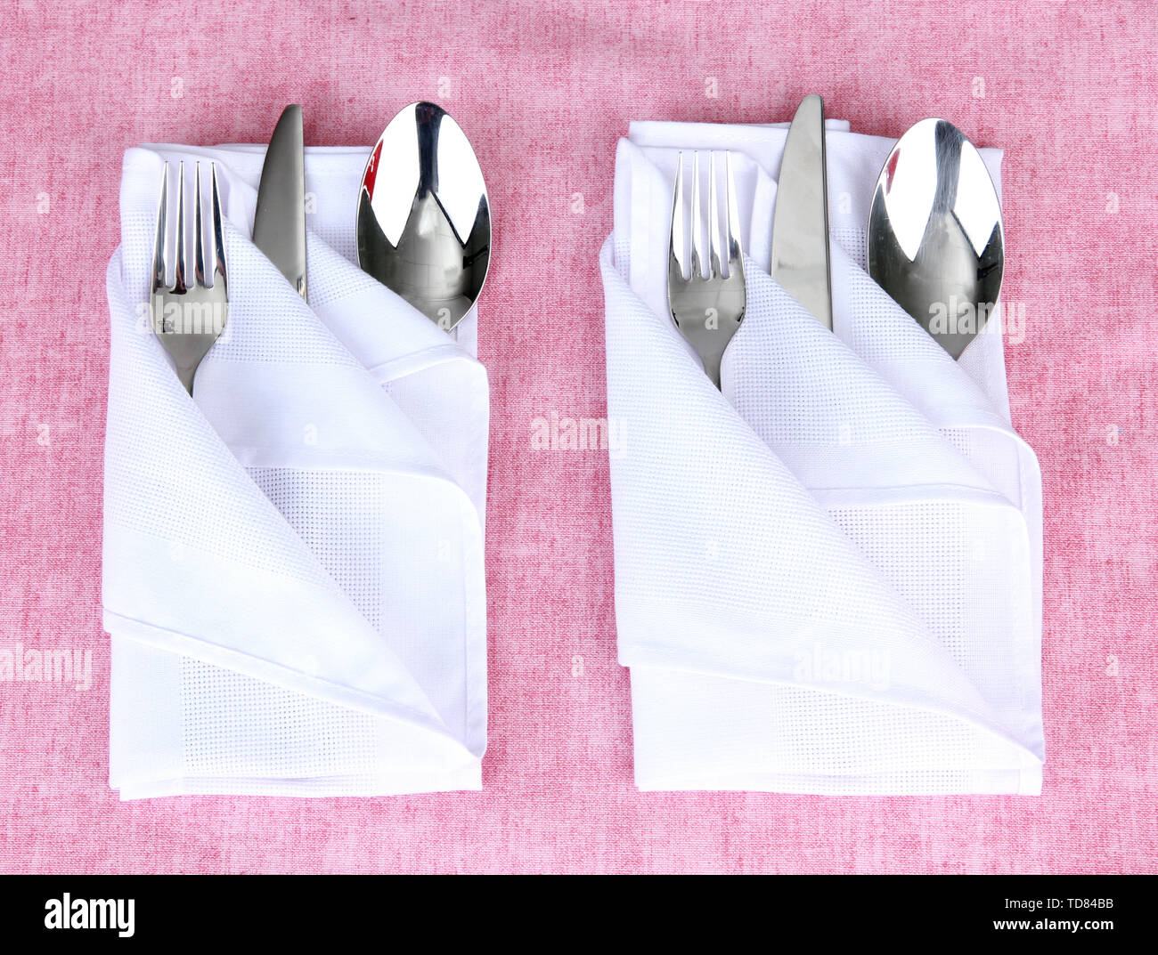 Folded Napkin With Fork Spoon And Knife On Color Background Stock Photo Alamy