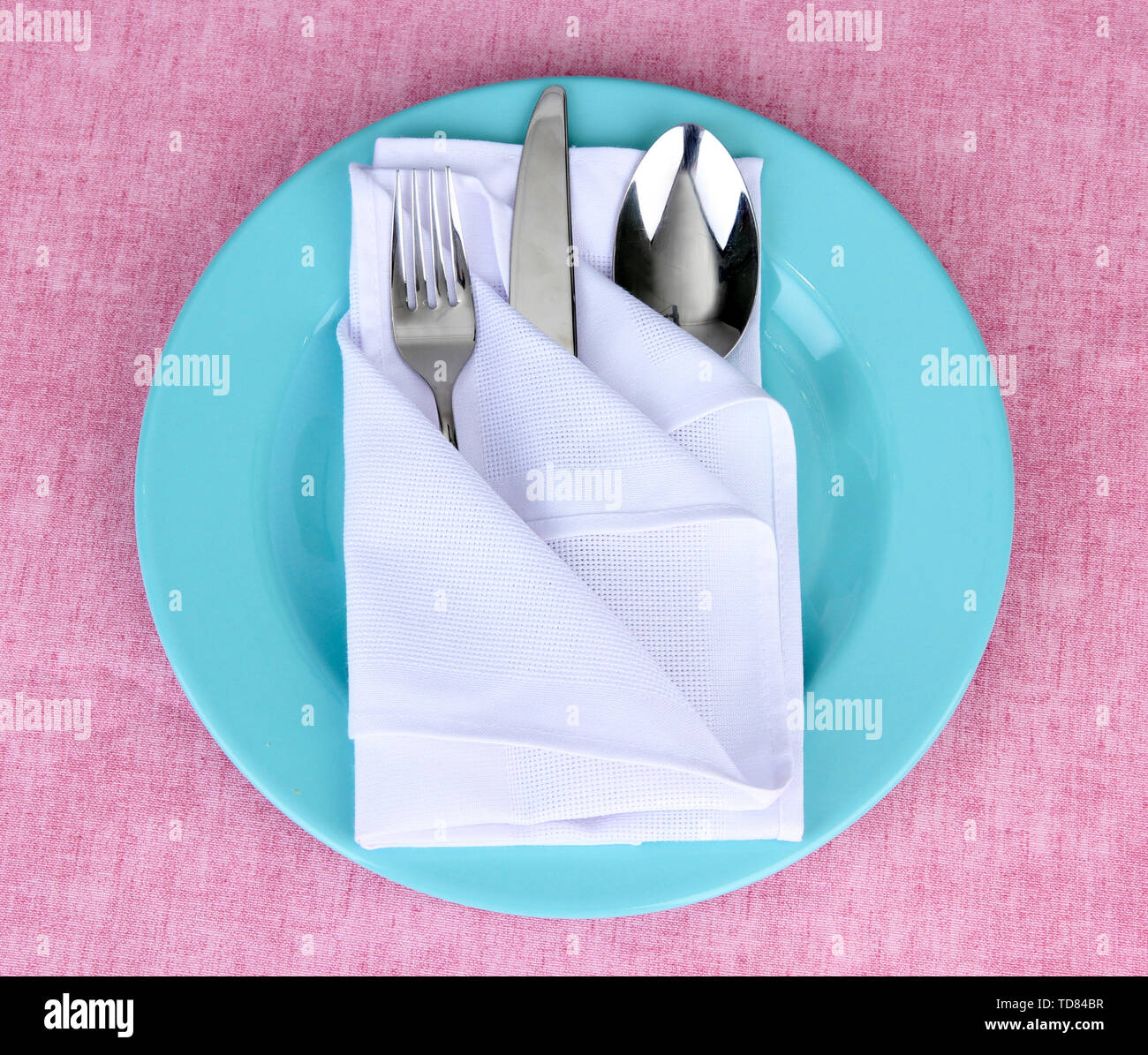 Folded Napkin With Fork Spoon And Knife On Plate On Color Background Stock Photo Alamy