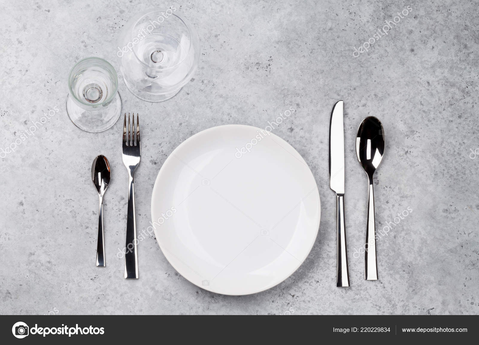 Table Setting Empty Plate Knife Fork Spoon Wine Glasses Napkin