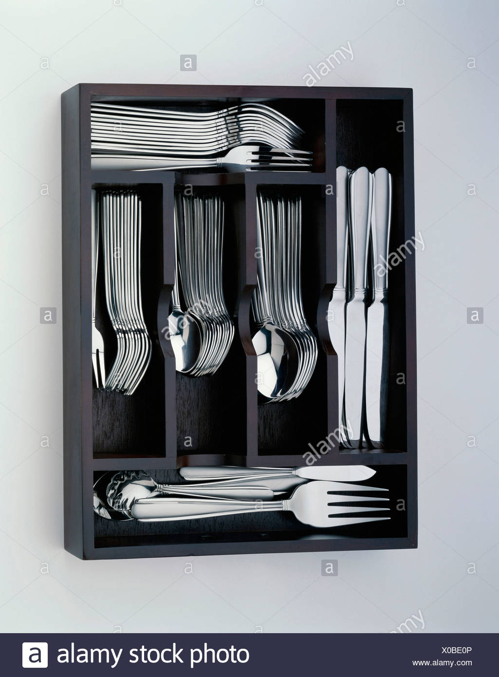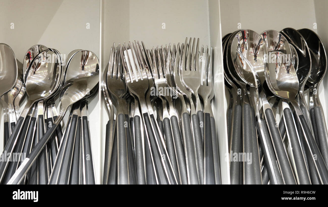 Close Up Of Spoons With Forks And Knives In A Cutlery Tray Stock Photo Alamy