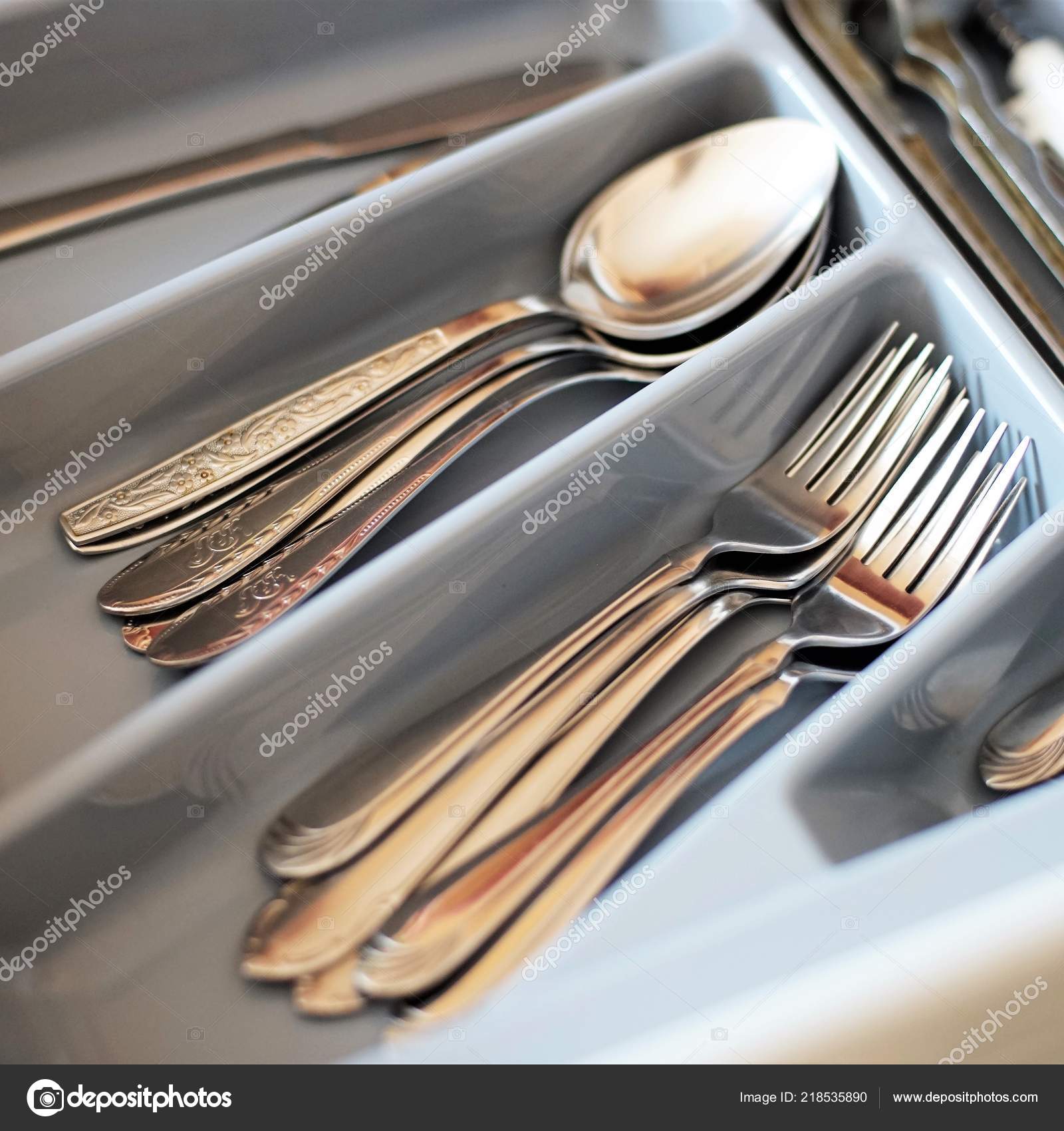 Set Dishes Plastic Tray Forks Spoons Knives Kitchen Drawer Stock Photo C Sonymoon 218535890