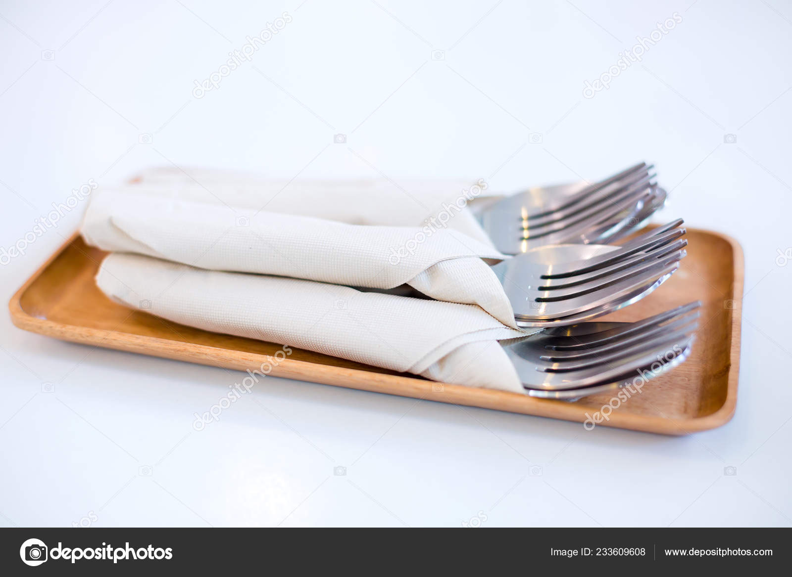 Spoon Fork Wrapped Tissue Paper Wooden Tray Restaurant Stock Photo C Phranai2006 Gmail Com 233609608
