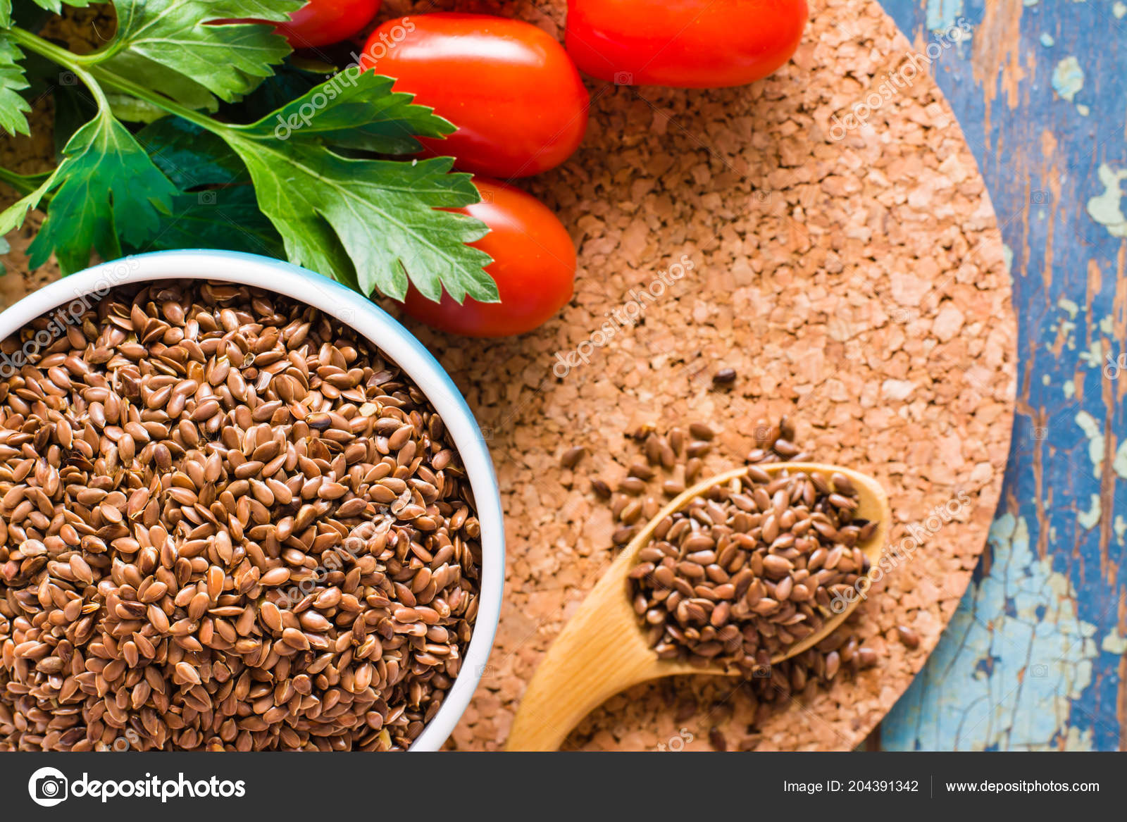 Flax Seeds Spoon Bowl Fresh Vegetables Wooden Table Top View