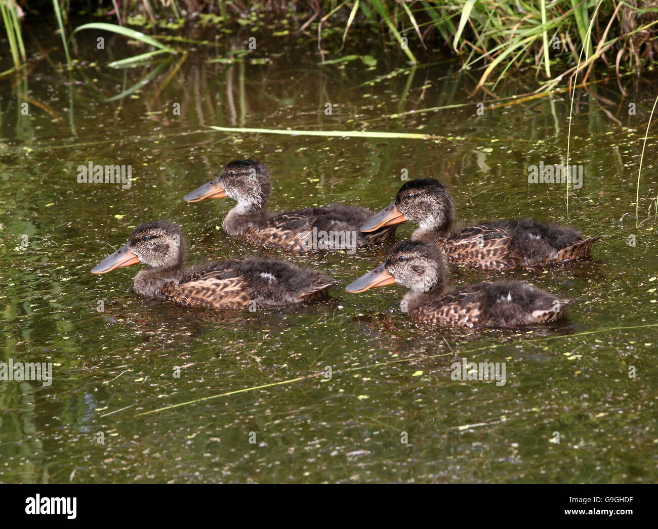 Four Northern Shoveler Ducklings Anas Clypeata Swimming Together