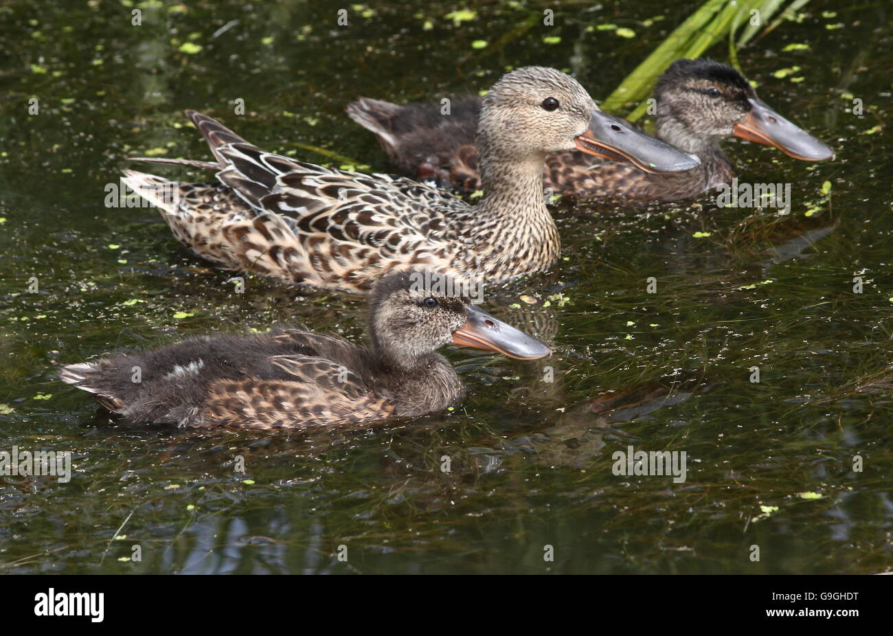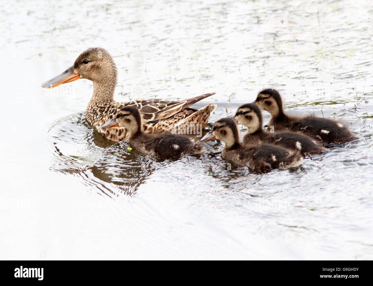 Female Northern Shoveler Duck Anas Clypeata Swimming With Four