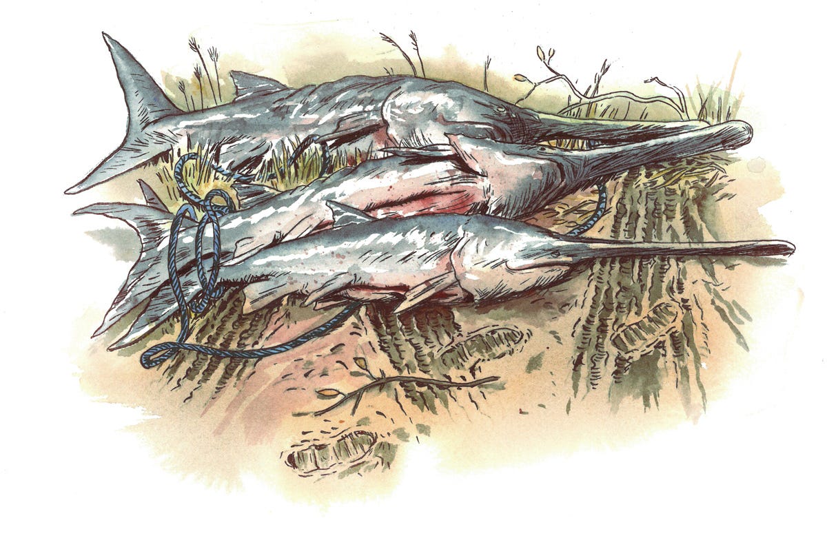 American Paddlefish Polyodon Spathula Line Art And Full Color Illustrations