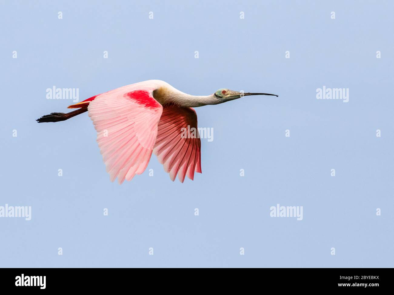 The Roseate Spoonbills Platalea Ajaja Flying In The Blue Sky