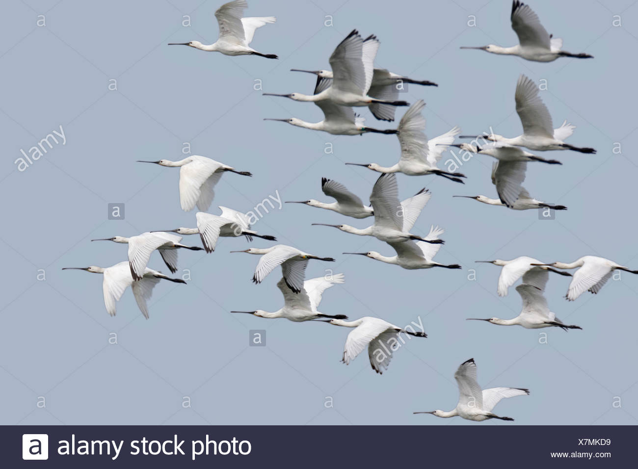 Eurasian Spoonbill Or Common Spoonbill Platalea Leucorodia Flock With Young Birds During The Autumn Migration Stock Photo Alamy