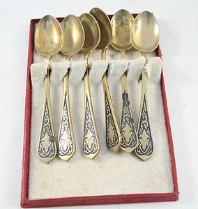 Thailand Gold Plated Set Of 6 Spoons Black Enamel Niello Willy Co