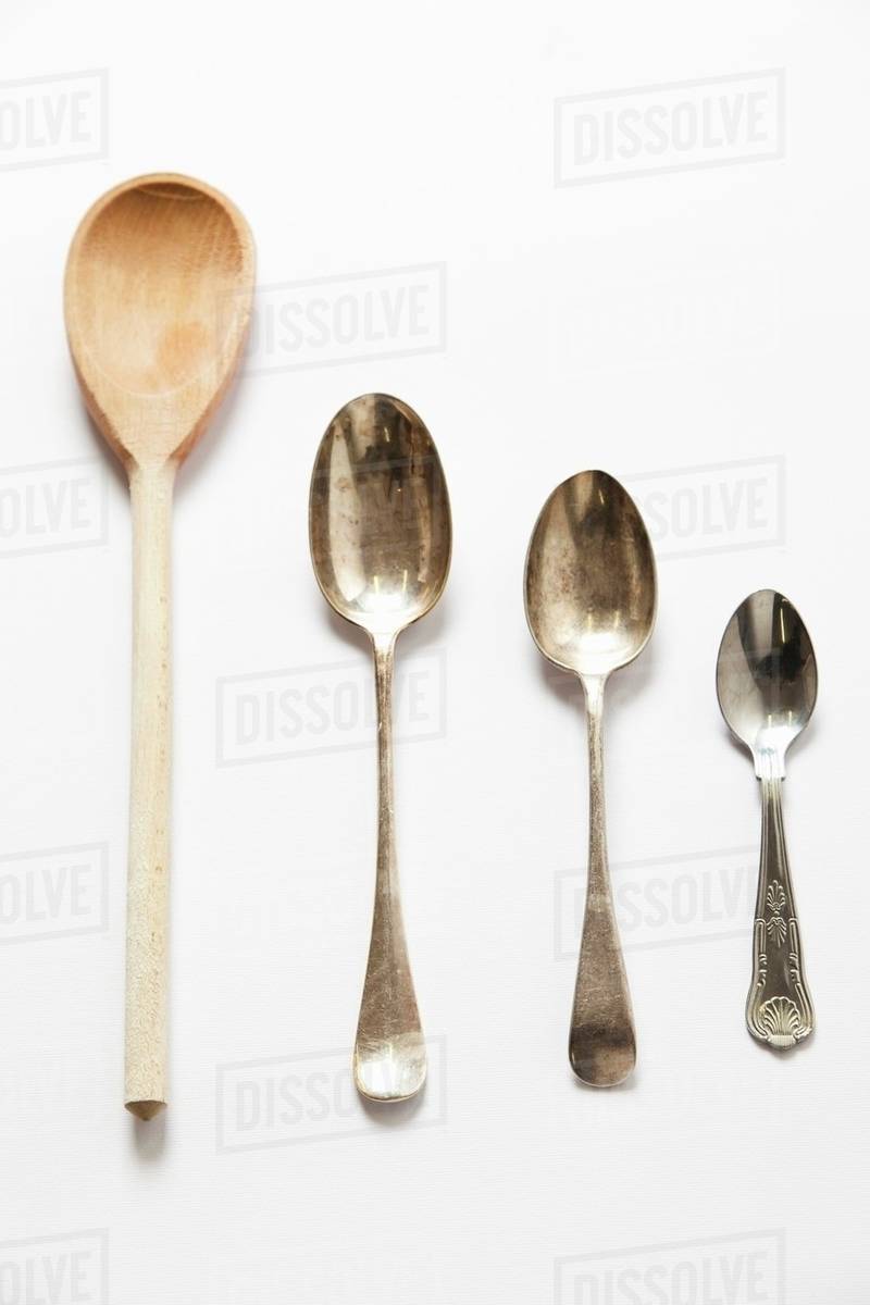 Wooden Spoon And Different Sized Metal Spoons Stock Photo Dissolve