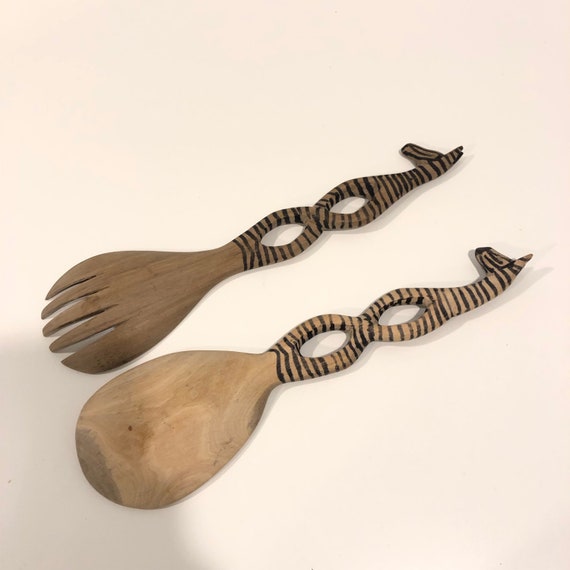 Vintage Wooden Zebra Salad Fork And Spoon Set Etsy